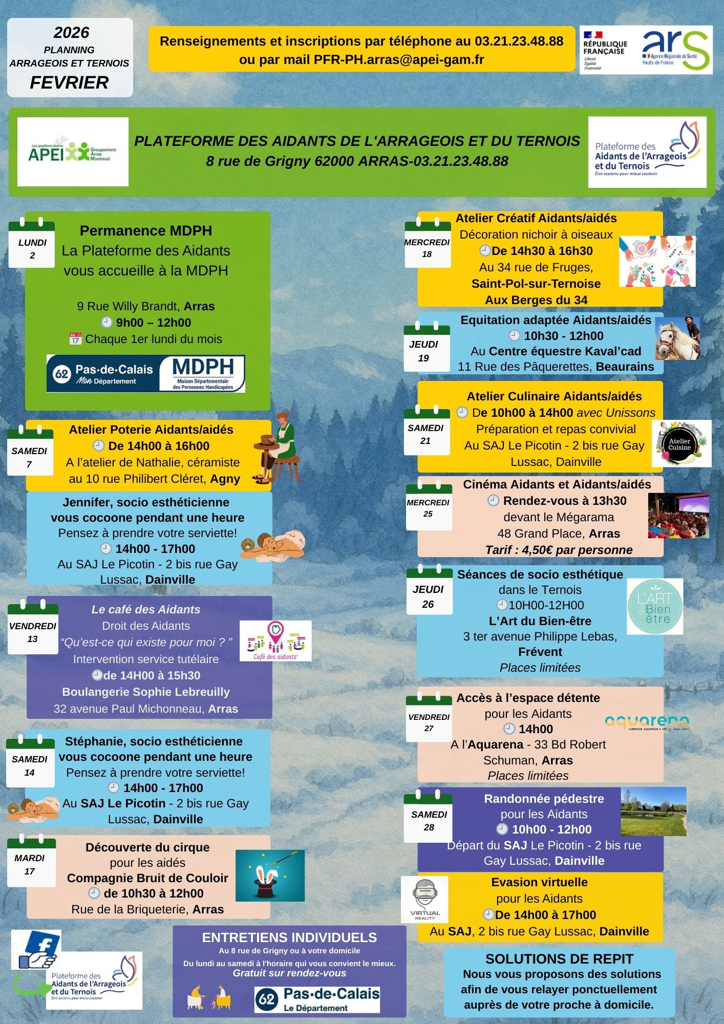Calendrier d’activités de la Plateforme des Aidants de l’Arrageois et du Ternois Février 2026