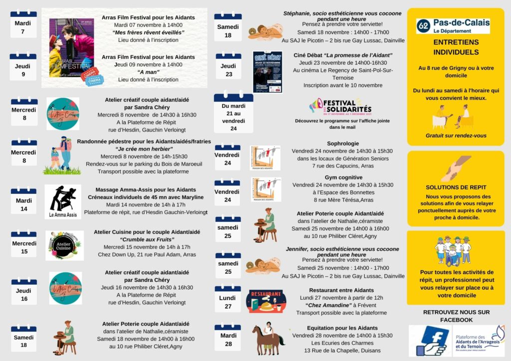 Calendrier de la Plateforme des Aidants de l’Arrageois et du Ternois NOVEMBRE 2023