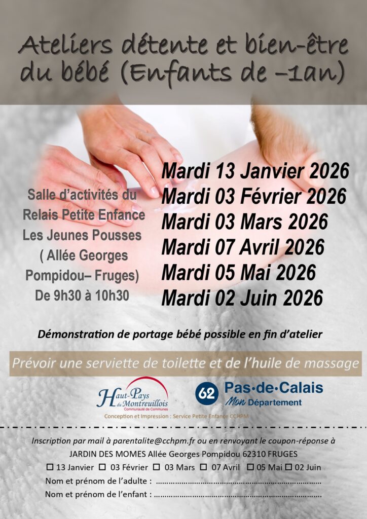 Découvrez les ateliers détente et bien être du bébé proposés par la Communauté de Communes du Haut Pays du Montreuil de janvier à juin 2026