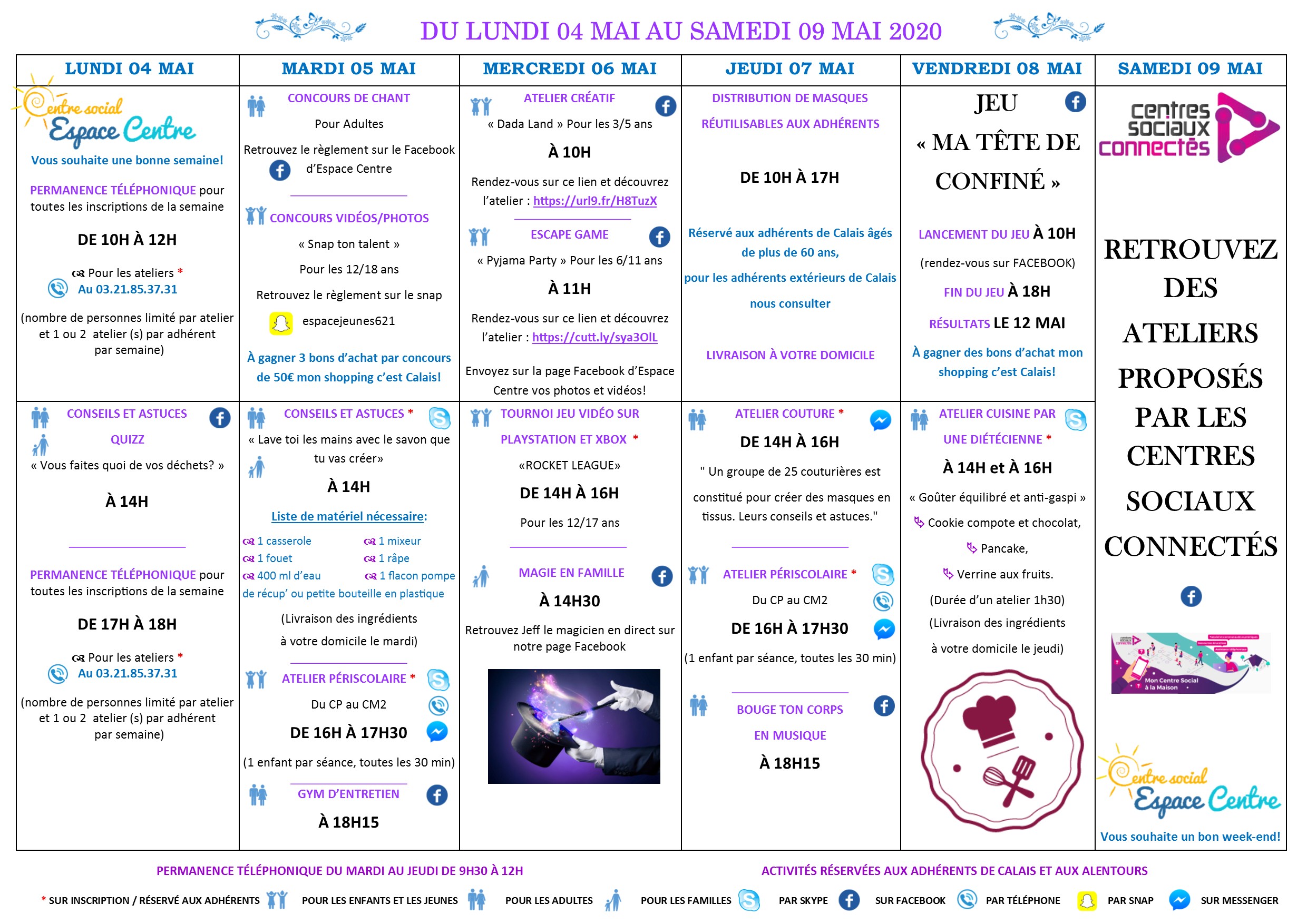 Espace centre Calais vous propose son programme d'activités à la maison, du 4 au 9mai 2020