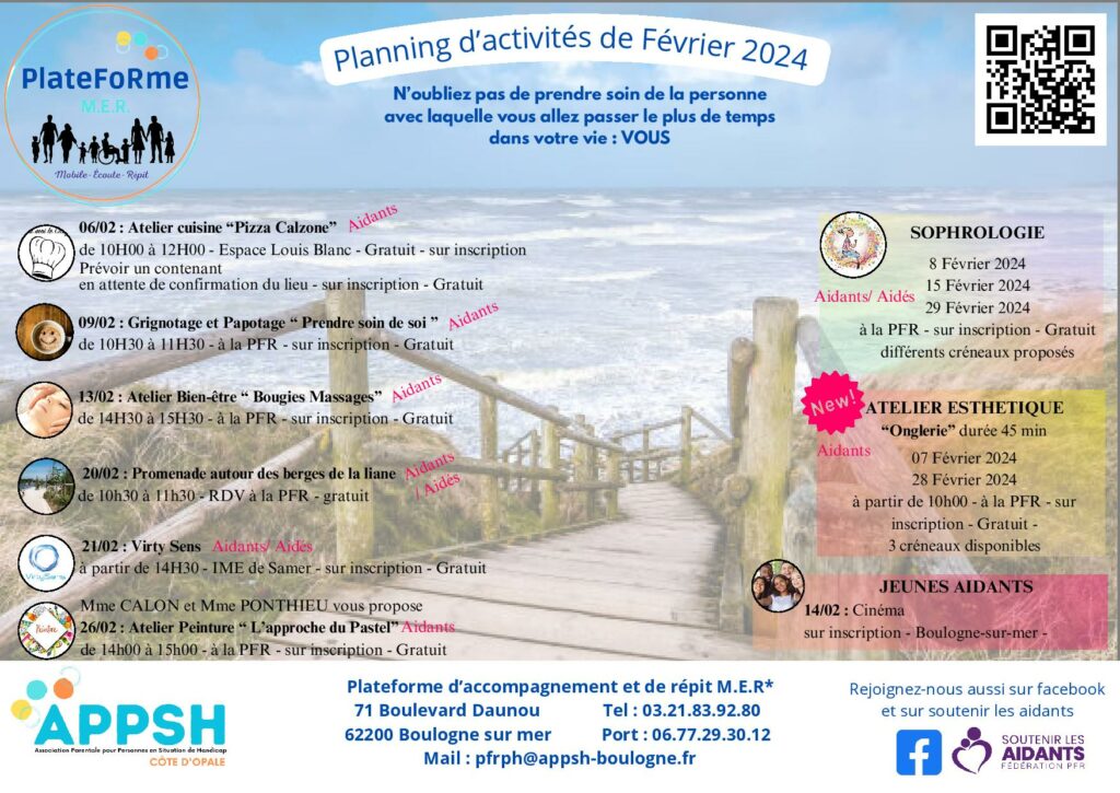 La plateforme d’accompagnement et de répit M.E.R située au 71 Boulevard Daunou à Boulogne sur Mer vous présente son programme d’activités pour le mois de février 2024.
