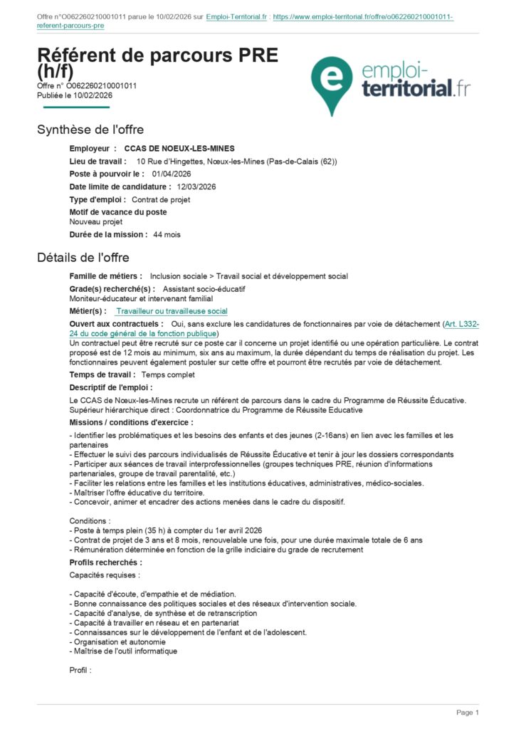 Le CCAS de Noeux-les-Mines recrute un référent de parcours pour le PRE