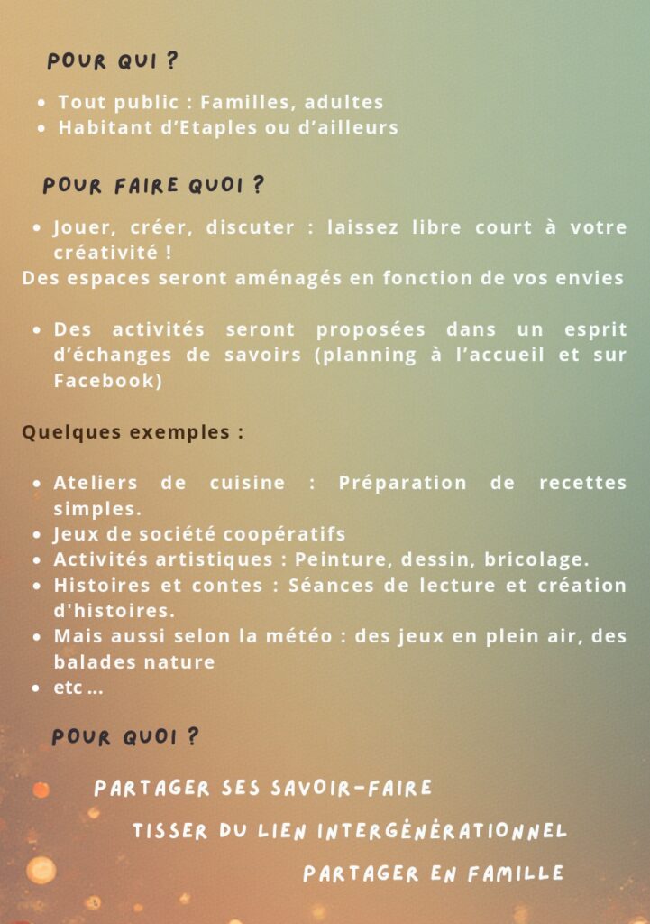 Le centre social d’Etaples propose des temps d’échanges et d’activités les samedis entre 13h30 et 16h « Les samedis en famille et pour tous »