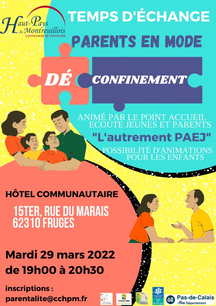 Mardi 29 mars de 19h à 20h30 à Fruges la CCHPM organise un temps d’échanges entre parents animé par le Point Accueil Ecoute Jeunes et Parents
