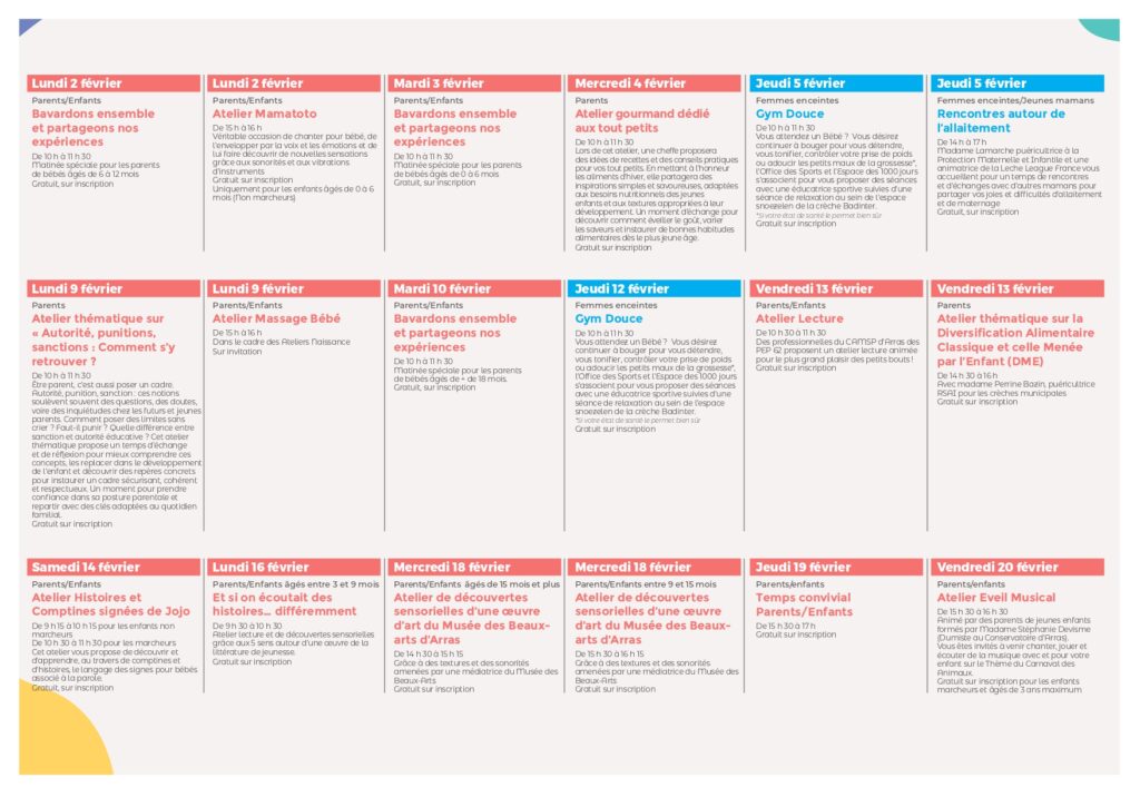 Planning du mois de Février 2026 de l’espace 1000 jours d’Arras