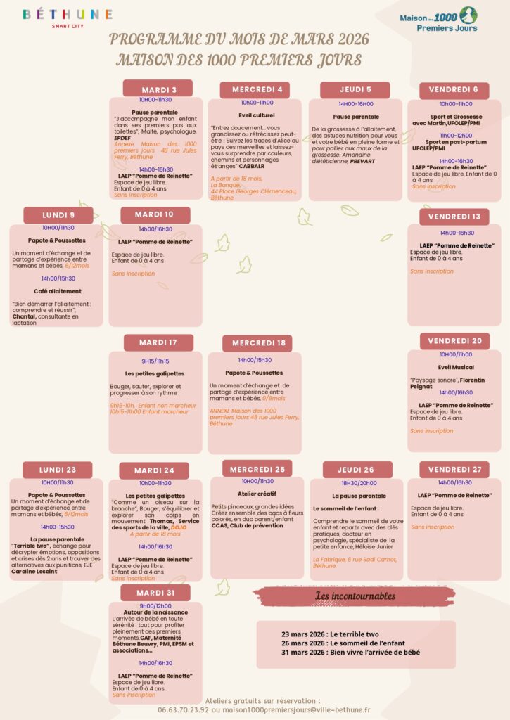 Programmation des ateliers de mars 2026 – Maison des 1000ers jours Béthune