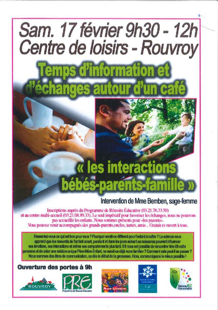 Temps d’information et d’échanges autour d’un café  » Les Interactions bébés-parents-familles » avec Mme Bemben sage femme le Samedi 17 février de 9h30 à 12 au Centre de Loisirs de Rouvroy