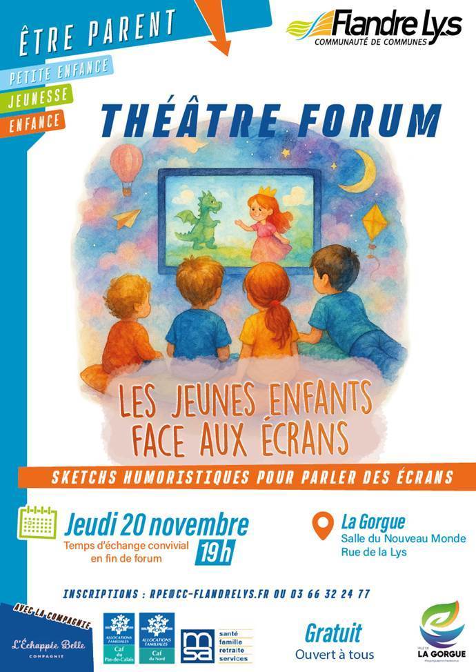 L’équipe du Relais Petite Enfance Flandre Lys est ravie de vous convier au THEATRE FORUM du jeudi 20 novembre à 19h à la salle polyvalente du Nouveau Monde rue de La Lys à La Gorgue.